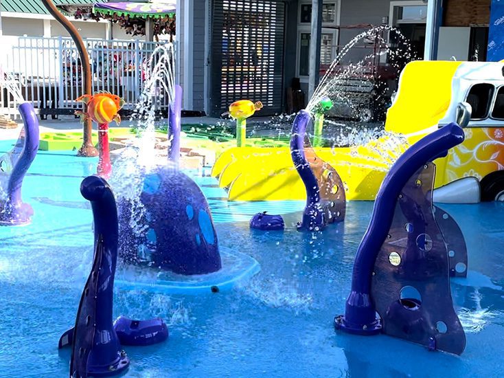 Play among the fantastic creatures, climb aboard the fun bus, dip under the cascading water flowers, or get soaked by the big bucket. Sail past the palm trees on the coolest slides ever!